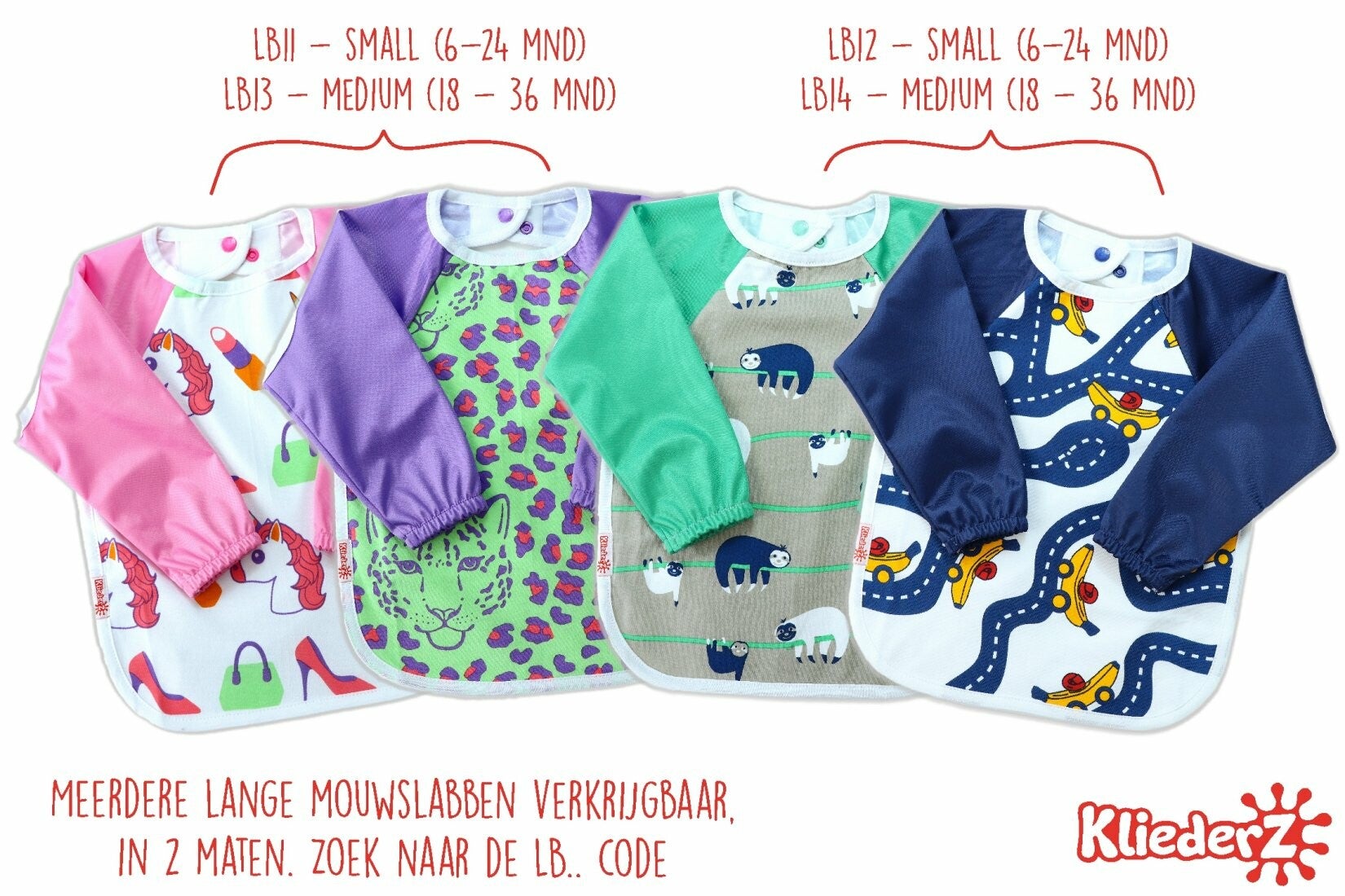 De slabbetjes zijn zo ontworpen dat ze lang genoeg zijn en goed aansluiten. Alles afgestemd op onze eigen ervaringen als ouder. Bij KliederZ kun je puntslabbetjes, eetslabbetjes en lange mouwen slabben in de maat S en M kopen. Deze slab voor peuters heeft maat M. Deze maat past over het algemeen (gemiddeld) bij kinderen tussen de 1,5 en 3 jaar. Gemiddeld te vergelijken met een kindermaat tussen 80 en 110.