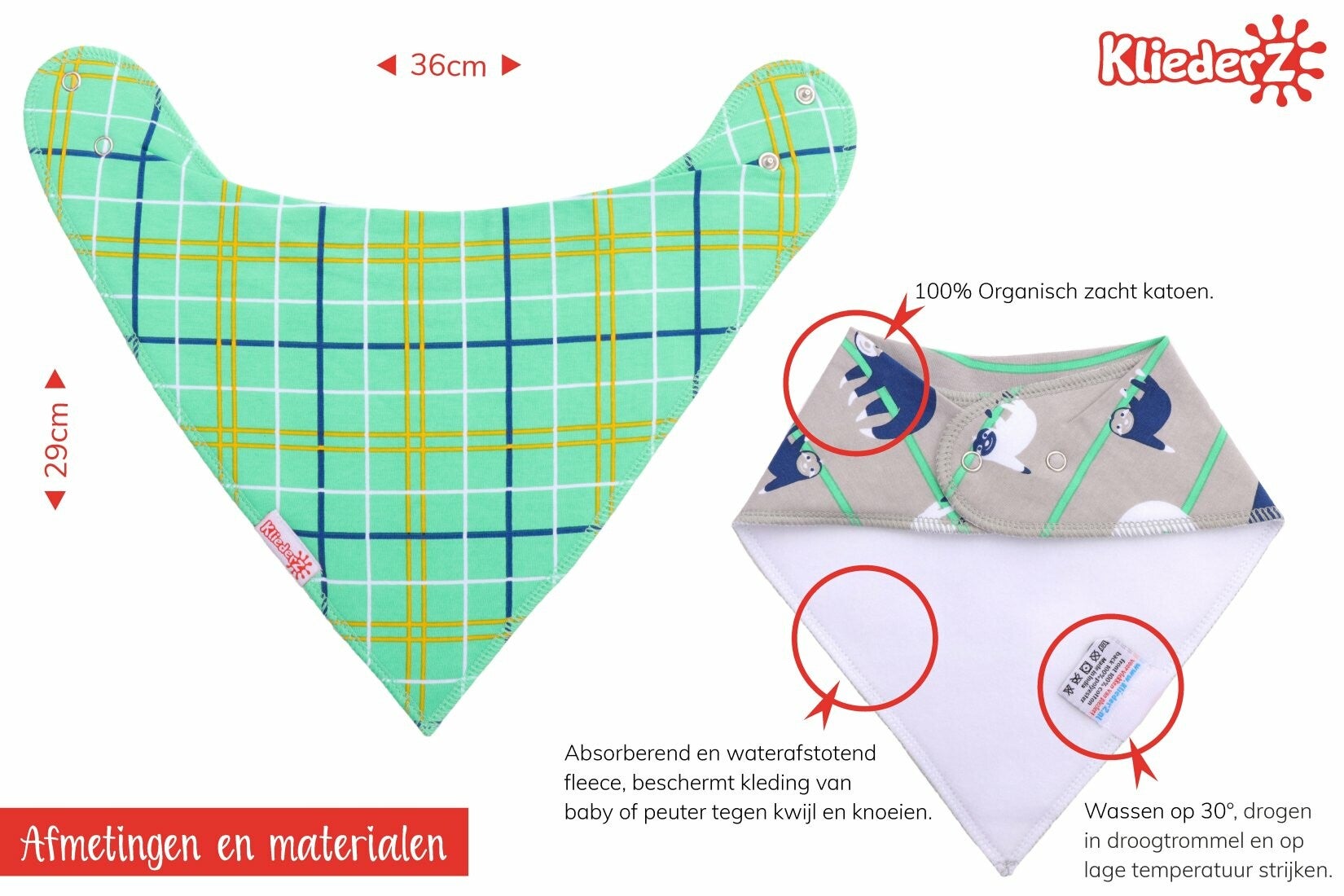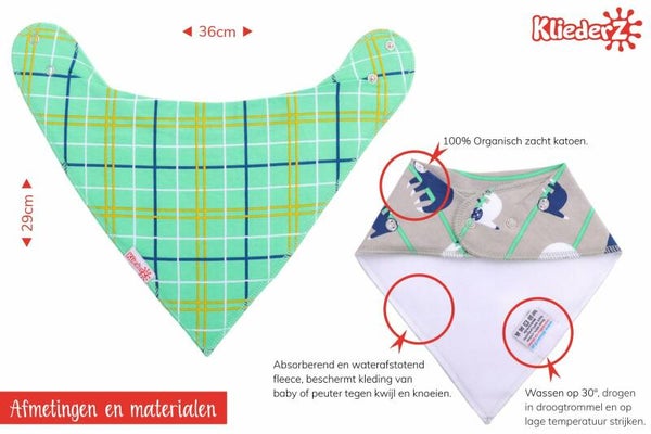 De bandana bibs, oftewel puntslabben, van KliederZ beschermen het kindje bij extra veel kwijlen en speeksel. De waterafstotende binnenvoering van fleece is daarnaast ultra zacht. Deze baby slabbetjes zijn daardoor zeer comfortabel. De drukknoopjes in de nek zijn op diverse standen verstelbaar.