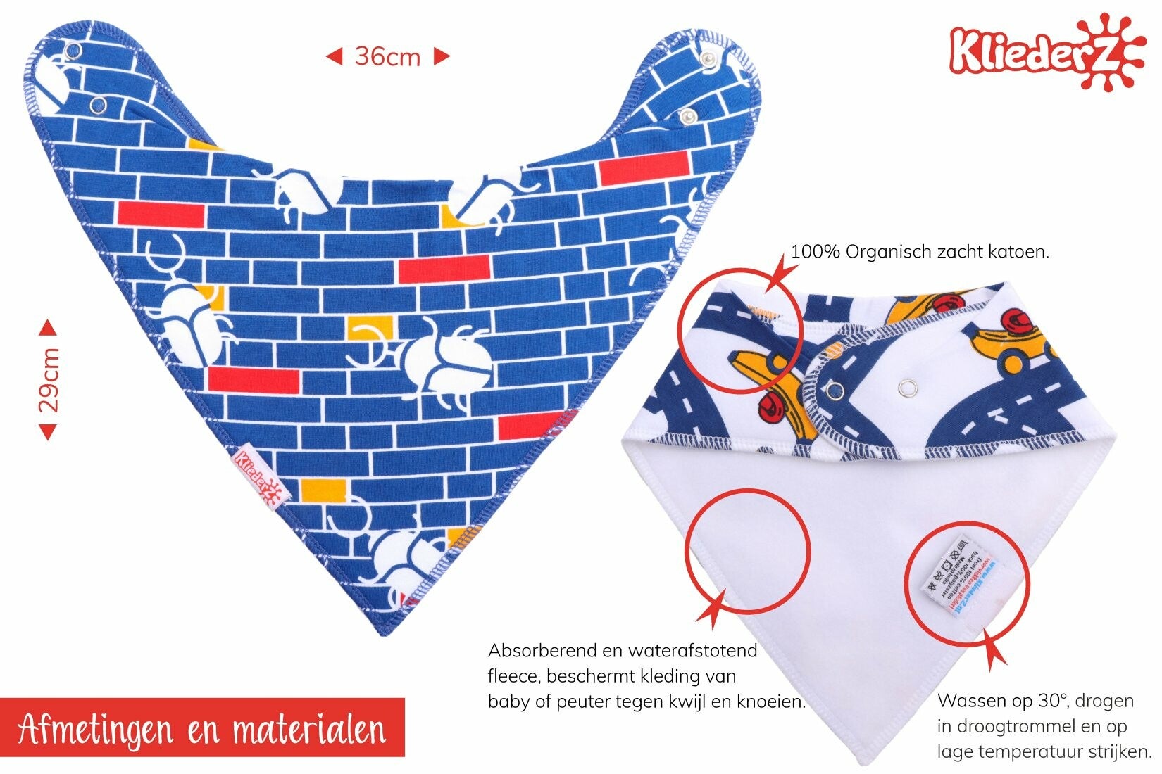 De bandana bibs, oftewel puntslabben, van KliederZ beschermen het kindje bij extra veel kwijlen en speeksel. De waterafstotende binnenvoering van fleece is daarnaast ultra zacht. Deze baby slabbetjes zijn daardoor zeer comfortabel. De drukknoopjes in de nek zijn op diverse standen verstelbaar.