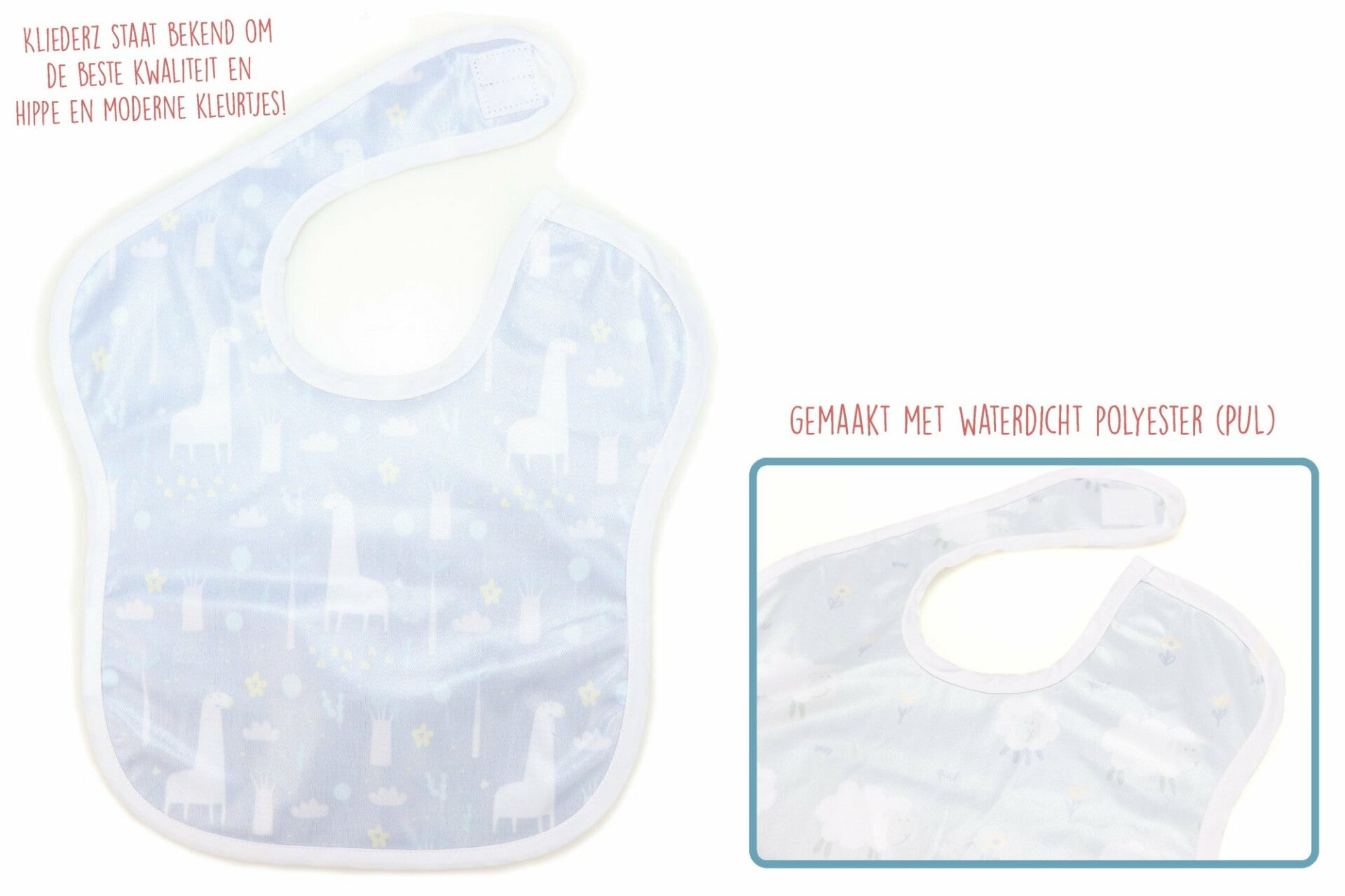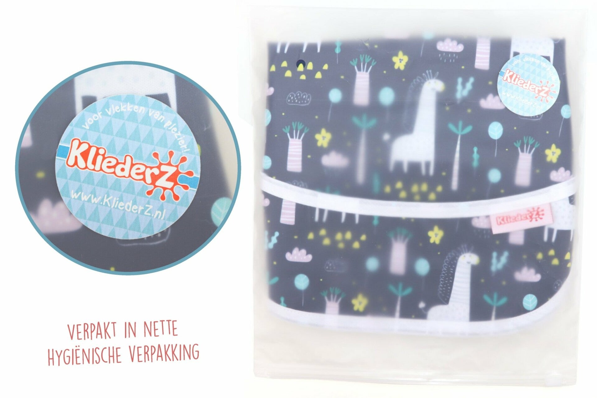 Deze set bestaat uit 2 vrolijke, hippe jongens slabbetjes met opvangzakje. Bij KliederZ geven wij al onze slabbetjes een naam. Deze set bestaat uit ‘Langnek’ en donkerblauwe slab met een kijkje op de savanne. De vrolijke print wordt afgewisseld met Giraffes, boompjes en struikjes. De tweede slab heet ‘Wollig’ en daar vallen direct de grappige schaapjes op getekend op een blauwgrijze achtergrond.